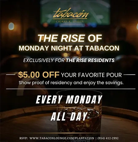 Every Monday, residents of The Rise Plantation Walk can enjoy $5 off everything at the bar at Tabacon Plantation.